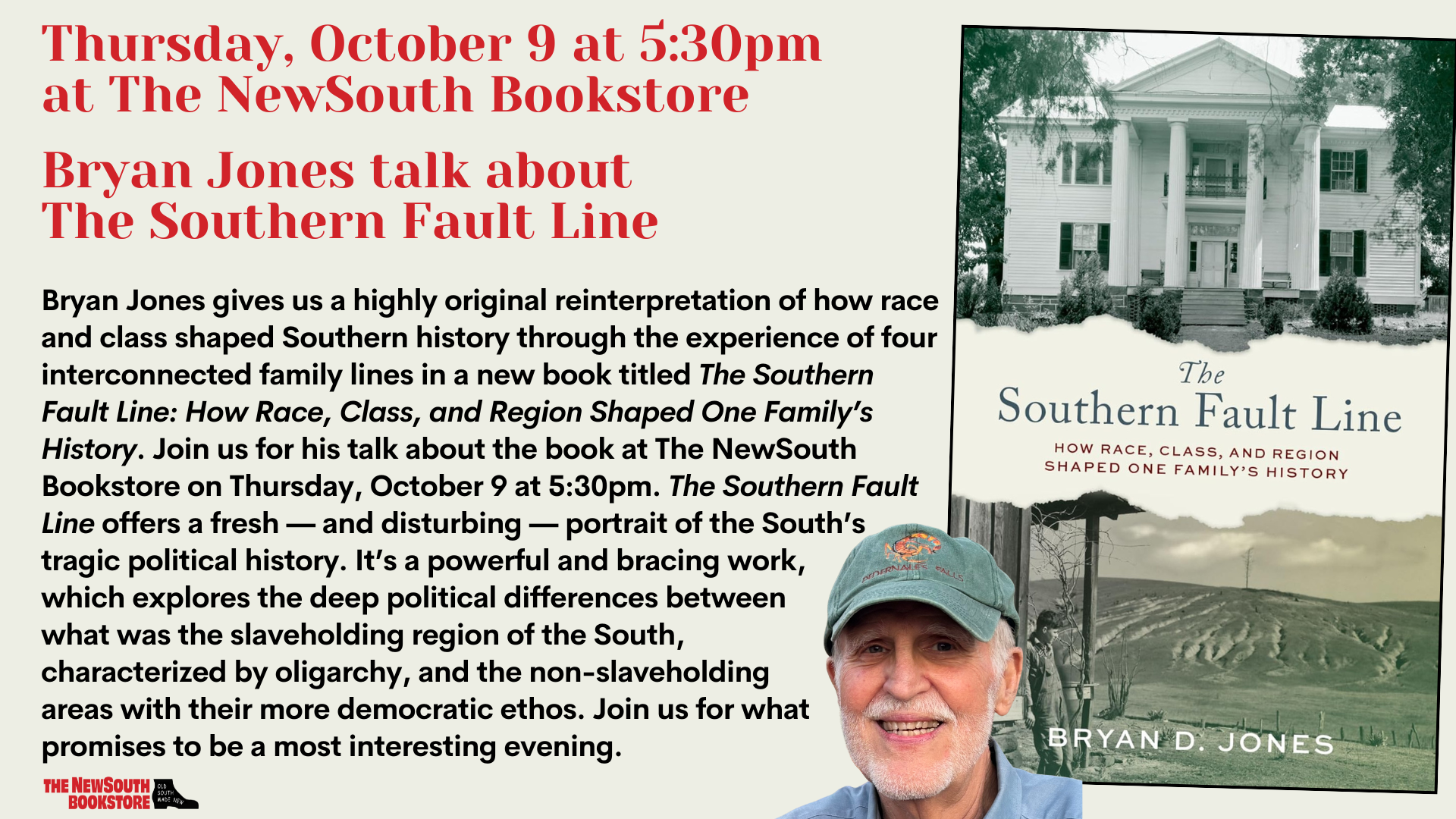 Bryan Jones gives us a highly original reinterpretation of how race and class shaped Southern history through the experience of four interconnected family lines in a new book titled The Southern Fault Line: How Race, Class, and Region Shaped One Family’s History. Join us for his talk about the book at The NewSouth Bookstore on Thursday, October 9 at 5:30pm. The Southern Fault Line offers a fresh — and disturbing — portrait of the South’s tragic political history. It’s a powerful and bracing work, which explores the deep political differences between what was the slaveholding region of the South, characterized by oligarchy, and the non-slaveholding areas with their more democratic ethos. Join us for what promises to be a most interesting evening.
