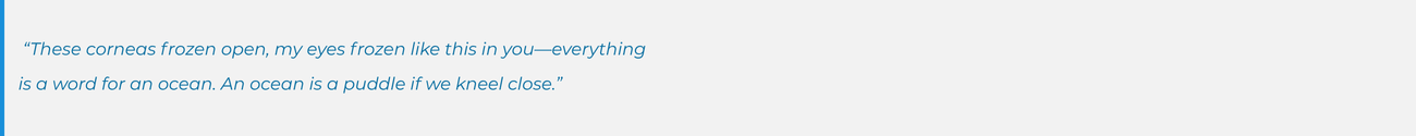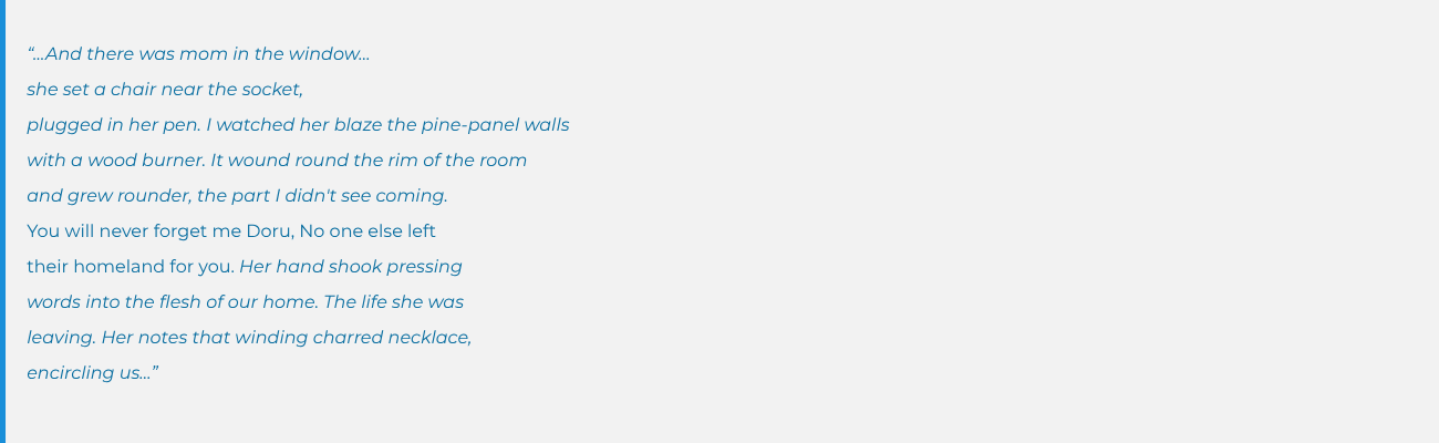 The thread of Stefanescu’s mother’s death and unexplainable grief and longing is a thread Stefanescu readers know from her previous volume, Dor, and is this book’s continuing question. Stefanescu allows her parents to speak about the choice they made to depart Romania during the repressive Ceaușescu regime. Her poem, “Karaoke Duet for Eastern Bloc Defectors” is written in her parents’ voices. So terribly moving and separated in two columns, Doru’s song and Lydia’s song: